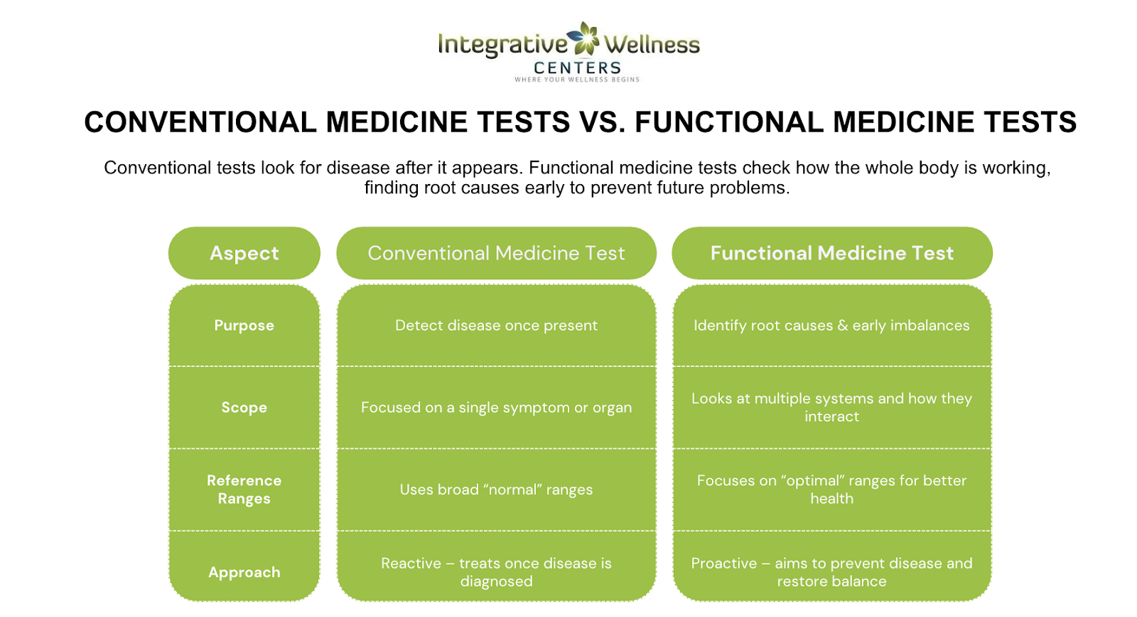Functional medicine tests take a broader view. Instead of just asking if you have a disease, they ask how well your body is working overall. By looking at patterns across hormones, gut health, inflammation, nutrients, and detox function, these tests help find root causes and catch problems early, so you can prevent illness and improve long-term health.